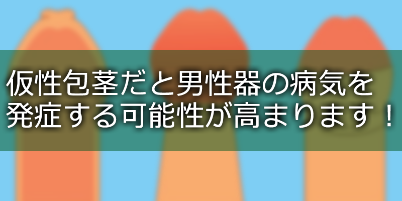 仮性包茎が原因で発症してしまう男性器の病気としましては、「亀頭包皮炎」や「尿路感染症」、「陰茎癌」、「小圭コンジローマ」等が挙げら、仮性包茎のままですと、他にも数多くの病気を発症する可能性が高くなってくると言われています。